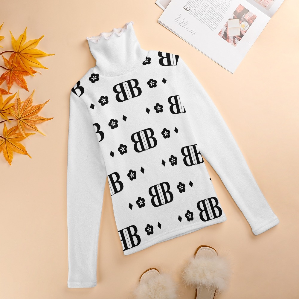Sweater features a lapel design that can be tucked or folded into the neck.